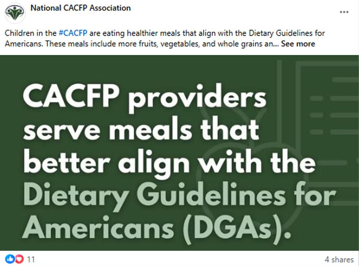 Join the National CACFP community on Facebook for crafts, snacks and other clever ideas shared daily. Get a dose of what's in the news, policy changes and CACFP-specific issues. Resources, printables and more!