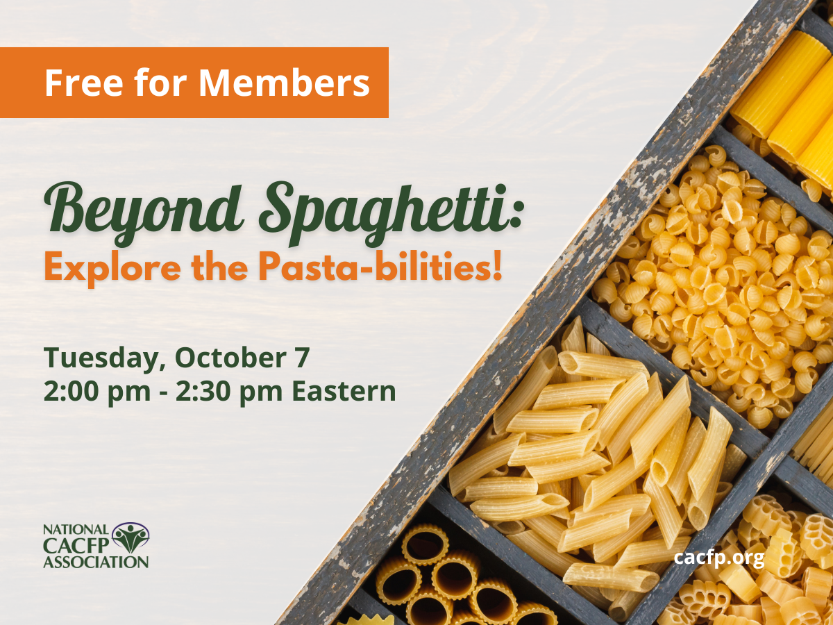 Pasta is more than a pantry staple; it's a versatile ingredient that kids love and CACFP providers can use creatively. Join us on Tuesday, October 7, to discover best practices for preparing and crediting different types of pasta, and get inspiration for kid-approved, budget-friendly recipes to add to your menu. This webinar is free for NCA members.