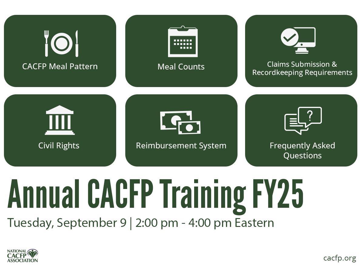 There's still time to get your annual CACFP training complete for FY25! We're holding our final webinar next Tuesday, September 9 from 2:00 pm - 4:00 pm Eastern. Get an overview of meal patterns, meal counts, claim submissions, key updates in the CACFP and more.
